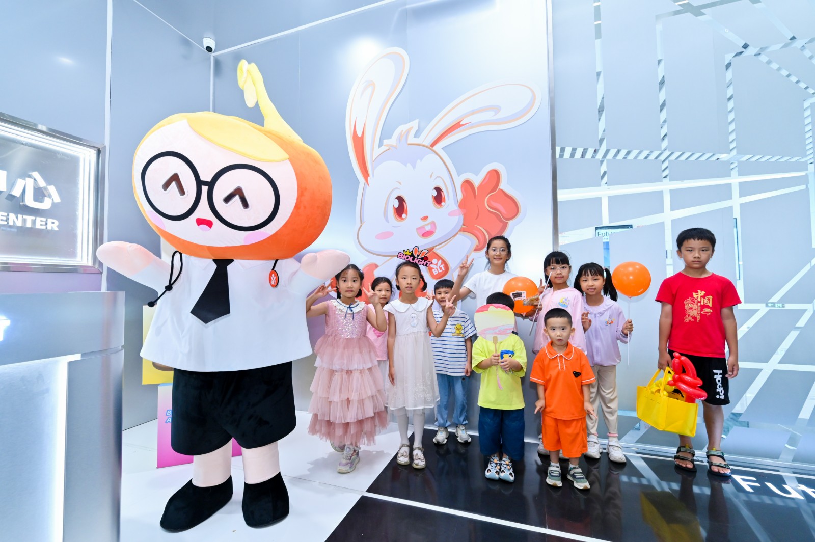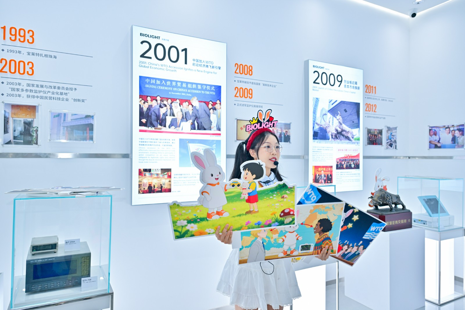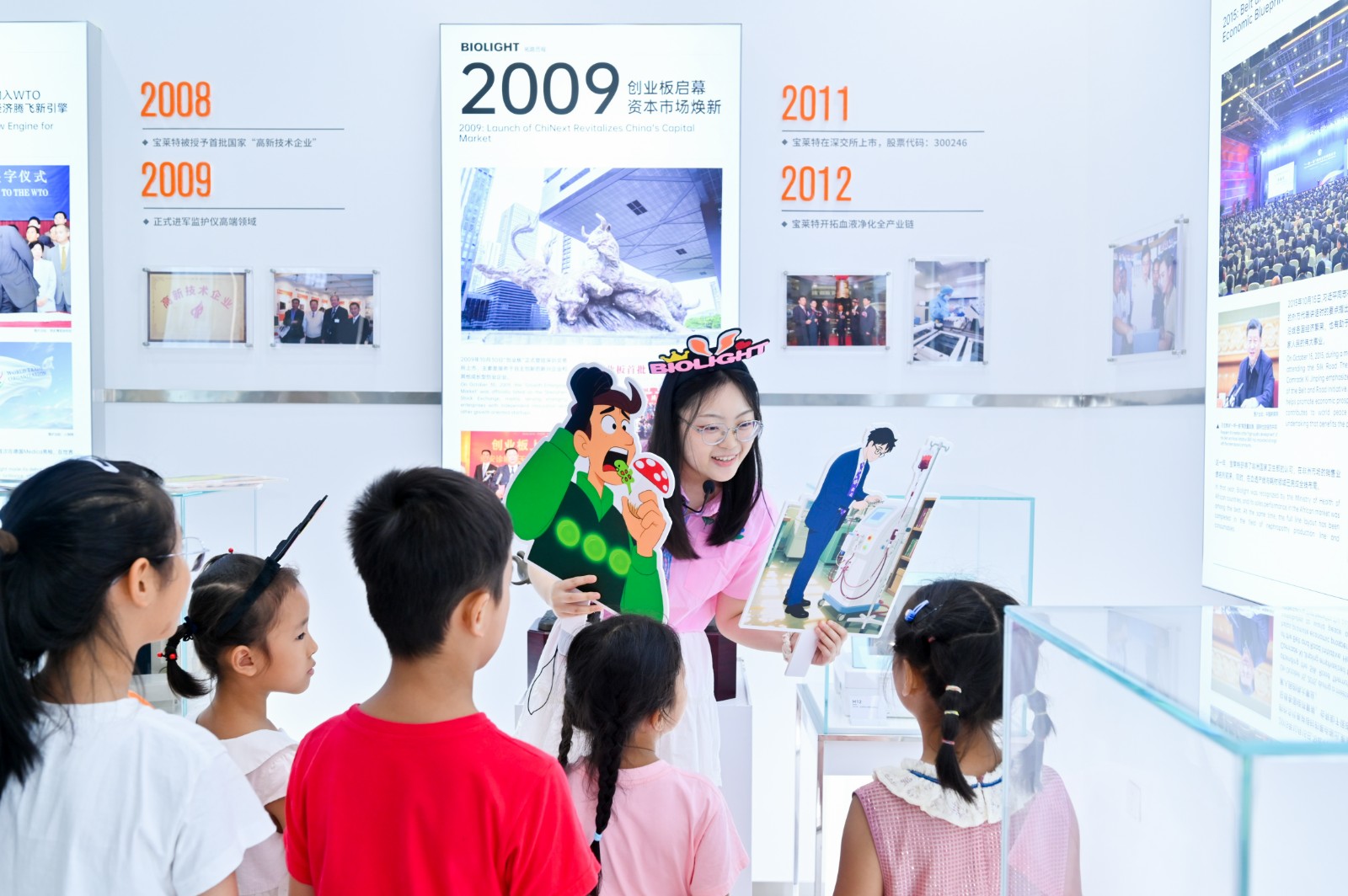 以童趣啟智: 兔子姐姐手持 “鄧小平南巡”“中國入世”卡通手舉牌,將企業史轉化為“寶萊兔的時光旅行”。孩子們從LOGO的雙手托起生命太陽中讀懂守護生命的初心。
