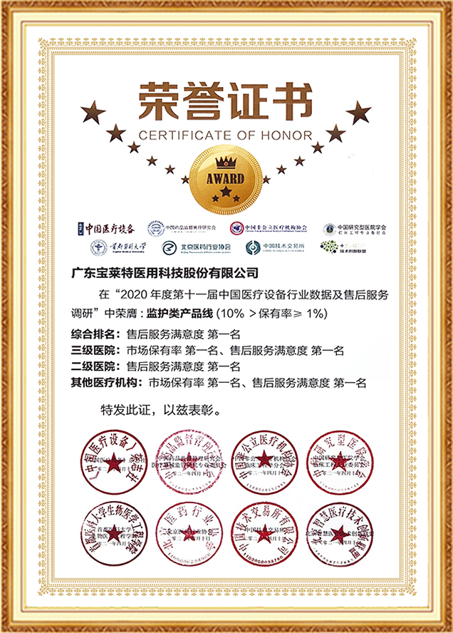 寶萊特以厚德精工的品質堅守和舍利抗疫的企業擔當,在2021年第十一屆中國醫療設備行業數據大會上榮膺“2020年度中國醫療設備產品線金獎〞“2020年度中國醫療設備優秀民族品牌金獎〞“2020年度中國醫療設備最具社會責任獎”三項大獎。2020年度中國醫療設備行業數據及售后服務調研”活動圍繞市場占有率、保有率、客戶滿意度等進行評分,寶萊特憑借著評分均在4分以上及各大三甲醫院和醫療機構售后服務滿意度第一名的實力,榮膺中國醫療設備優秀民族品牌金獎、中國醫療設備金獎。這是寶萊特在“中國智造”的浪潮中創變的體現。