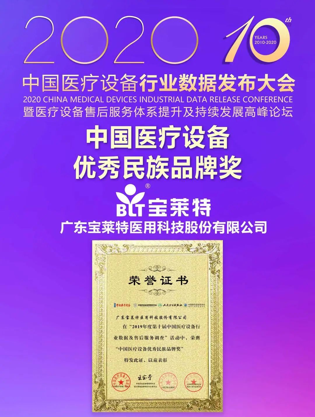 7 月 4 日,第十屆中國醫療設備行業數據發布大會暨醫療設備售后服務體系提升及持續發展高峰論壇盛大召開,寶萊特集團在本次“2019年度中國醫療設備行業數據及售后服務調查活動”中榮膺“中國醫療設備優秀民族品牌獎”,子公司武漢啟誠榮膺“中國醫療設備民族品牌突破獎”。