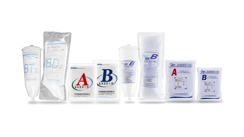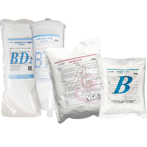 結構及組成:血液透析干粉由A粉、B粉組成。A粉成分為氯化鈉、氯化鈣、氯化鎂、氯化鉀、枸櫞酸;B粉成分為碳酸氫鈉。